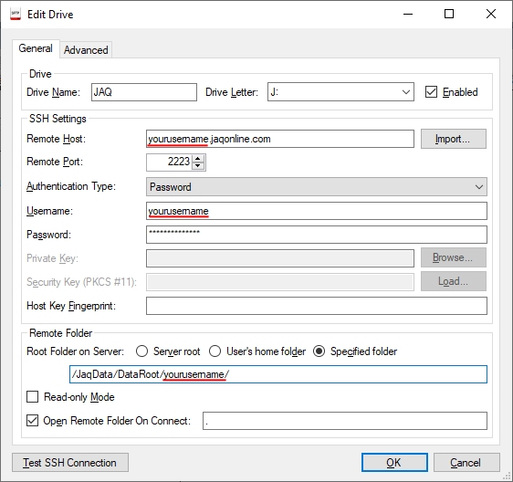 JAQ Software cloud servers use a protocol called SFTP to connect to a drive resource on a remote server. To map a drive on the remote JAQ server, you can either use a commercial software package called SFTP Drive 2022 from /n software. or install a free program called Winfsp.